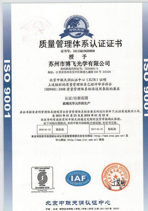 博飛光學通過ISO9001質(zhì)量管理體系自2008年開始進行質(zhì)量管理體系認證。我們建立了嚴格的質(zhì)量管理體系,嚴格控制產(chǎn)品質(zhì)量,確保每一件產(chǎn)品都符合國際標準,能夠提供優(yōu)良的光學性能。
