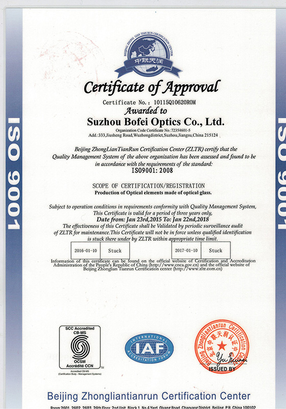 博飛光學通過ISO9001質(zhì)量管理體系自2008年開始進行質(zhì)量管理體系認證。我們建立了嚴格的質(zhì)量管理體系,嚴格控制產(chǎn)品質(zhì)量,確保每一件產(chǎn)品都符合國際標準,能夠提供優(yōu)良的光學性能。